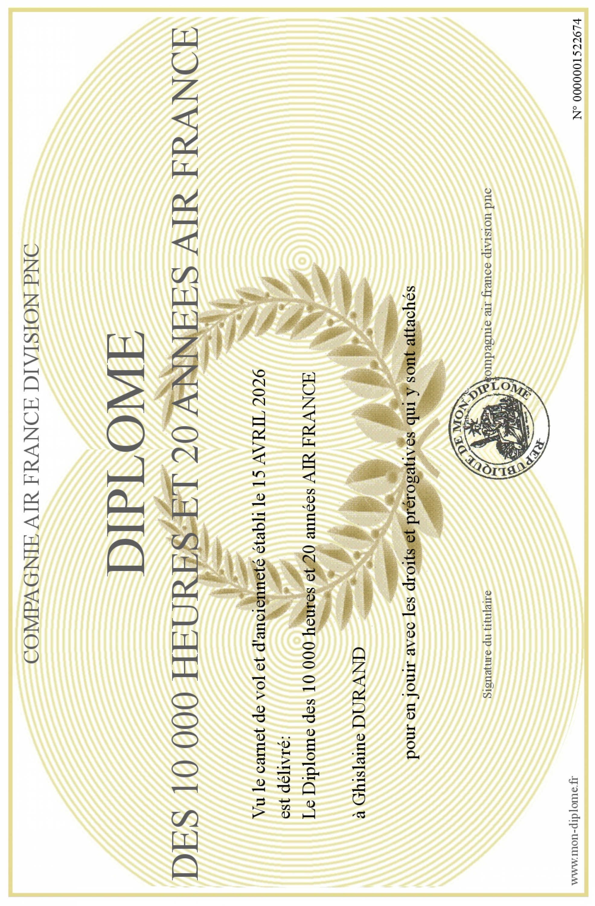 Envoyez par email votre Diplôme des 10 000 heures et 20 années AIR FRANCE personalisé