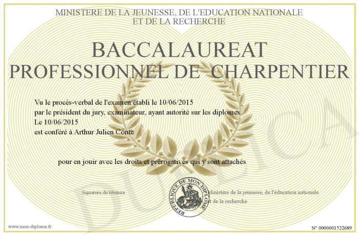 Envoyez par email votre baccalauréat professionnel de Charpentier personalisé