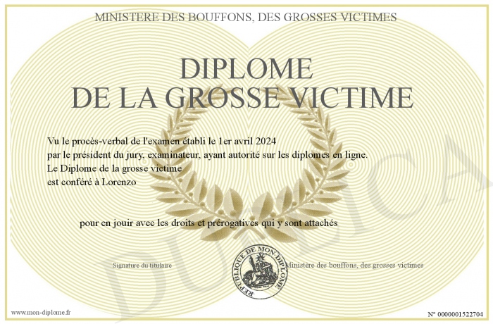 Envoyez par email votre Diplôme de la grosse victime personalisé