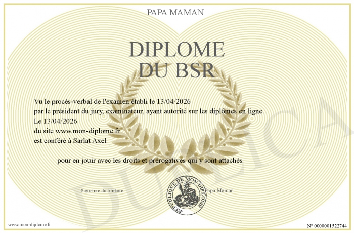Envoyez par email votre Diplôme du BSR personalisé