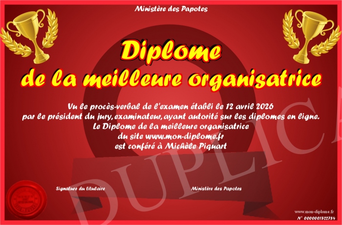 Envoyez par email votre Diplôme de la meilleure organisatrice personalisé