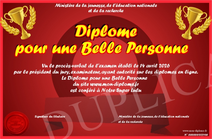 Envoyez par email votre Diplôme pour une Belle Personne personalisé