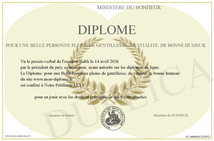 Envoyez par email votre Diplôme pour une Belle Personne pleine de gentillesse, de vitalité, de bonne humeur. personalisé