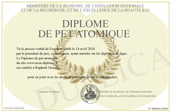 Envoyez par email votre Diplôme de pet atomique personalisé