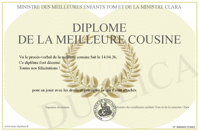Envoyez par email votre Diplôme de la meilleure cousine personalisé