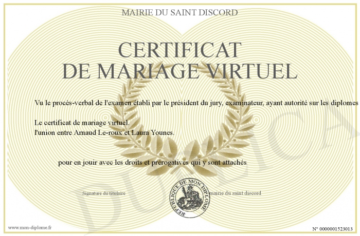 Envoyez par email votre CERTIFICAT DE MARIAGE VIRTUEL personalisé