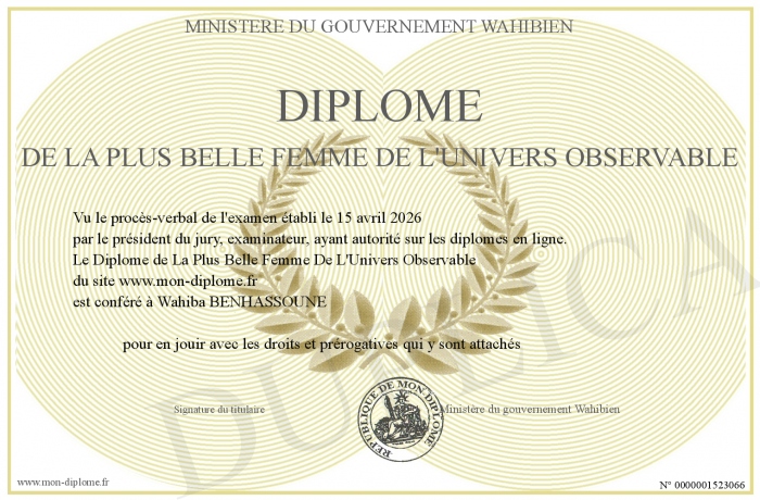 Envoyez par email votre Diplôme de La Plus Belle Femme De L'Univers Observable personalisé