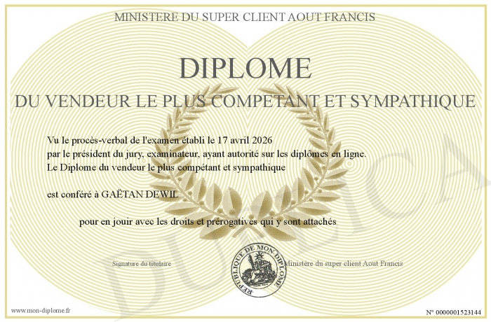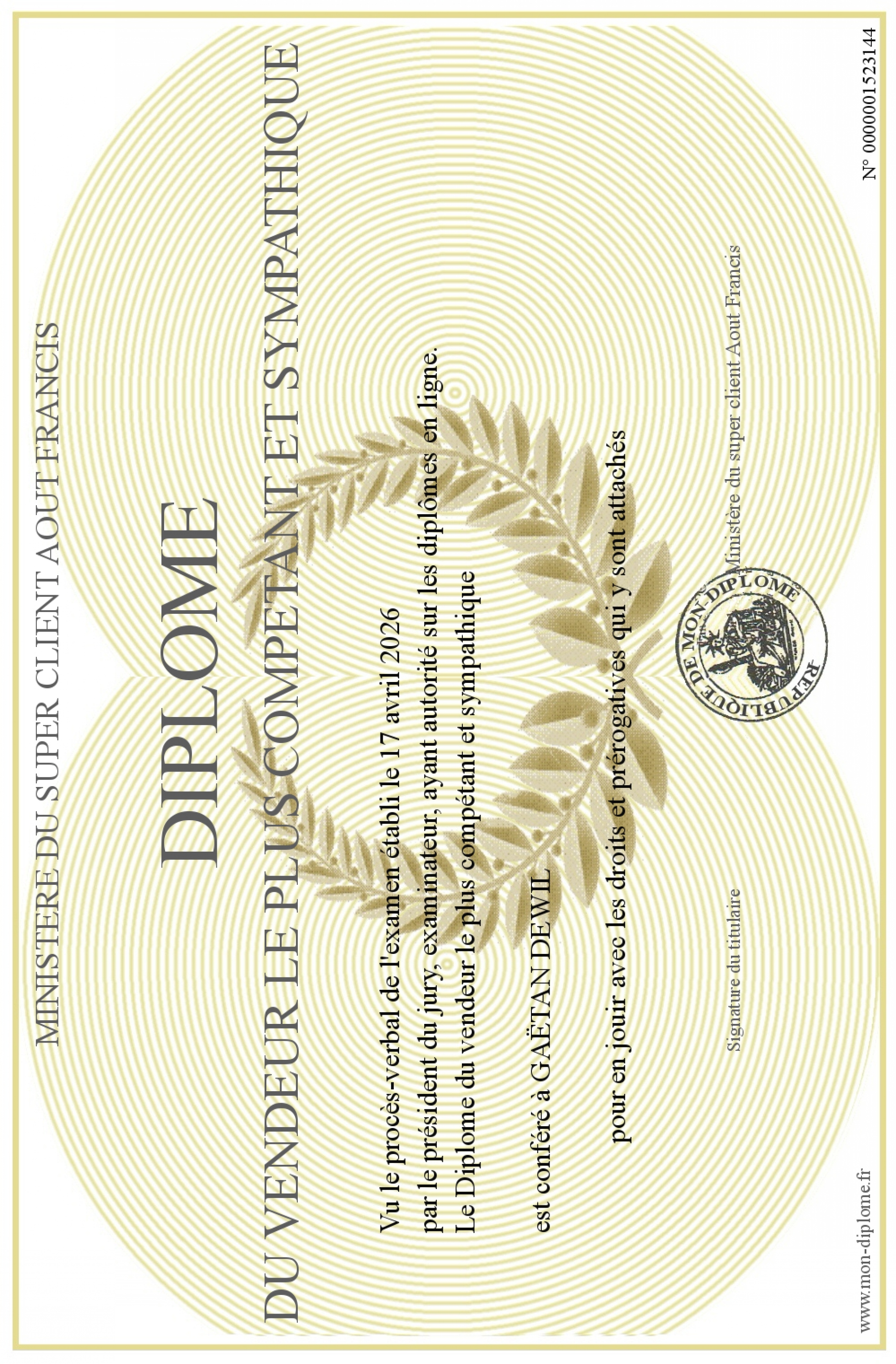 Envoyez par email votre Diplôme du vendeur le plus compétant et sympathique personalisé