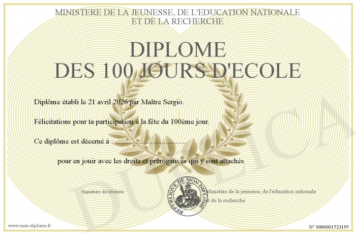 Envoyez par email votre Diplôme des 100 jours d'école personalisé