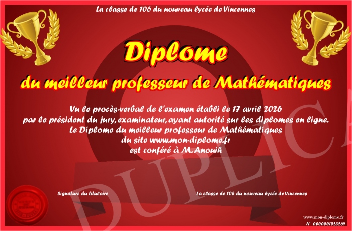 Envoyez par email votre Diplôme du meilleur professeur de Mathématiques personalisé