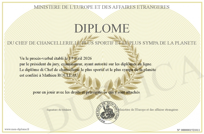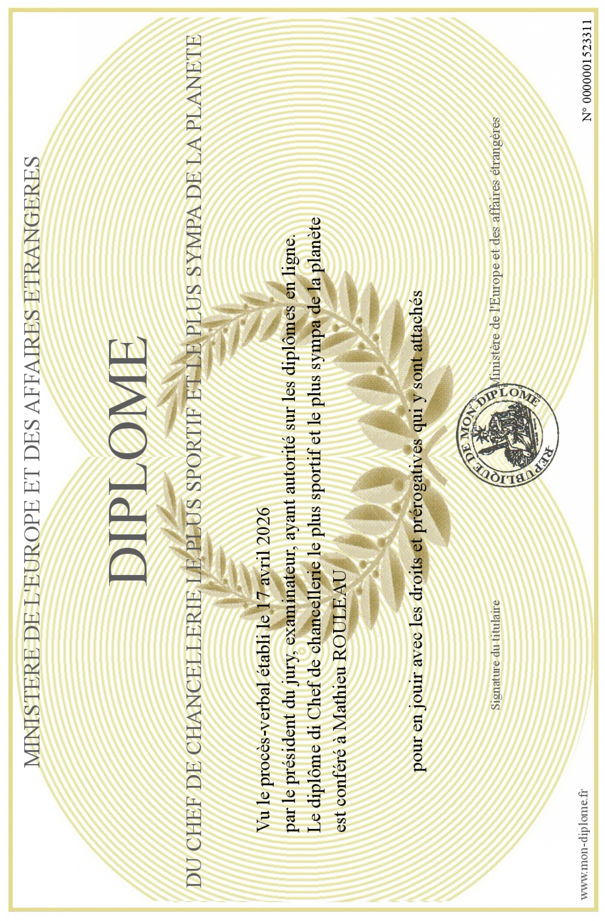 Envoyez par email votre Diplôme du Chef de chancellerie le plus sportif et le plus sympa de la planète personalisé