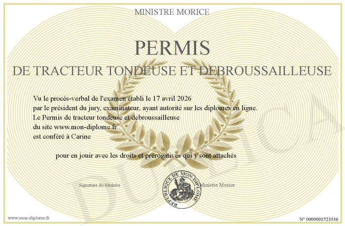 Envoyez par email votre Permis de tracteur tondeuse et debroussailleuse personalisé