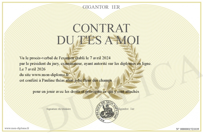 Envoyez par email votre Contrat du T'es a moi personalisé