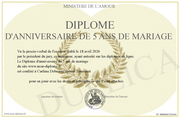 Envoyez par email votre Diplôme d'anniversaire de 5 ans de mariage personalisé