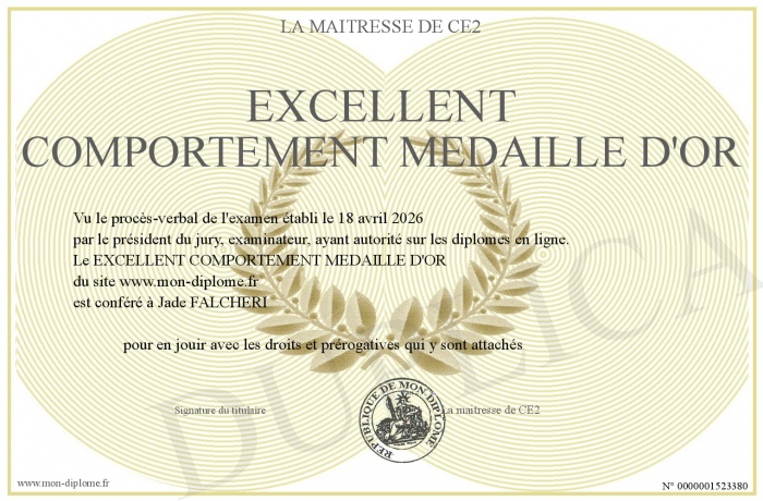 Envoyez par email votre EXCELLENT COMPORTEMENT MEDAILLE D'OR personalisé
