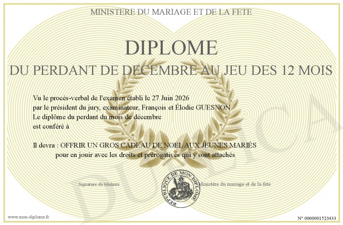 Envoyez par email votre Diplôme du perdant de décembre au jeu des 12 mois personalisé