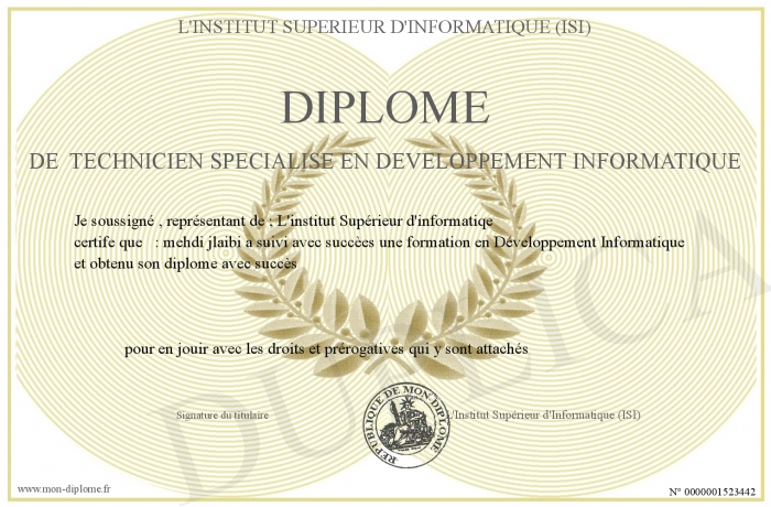Envoyez par email votre Diplôme de technicien spécialisé en développement informatique personalisé