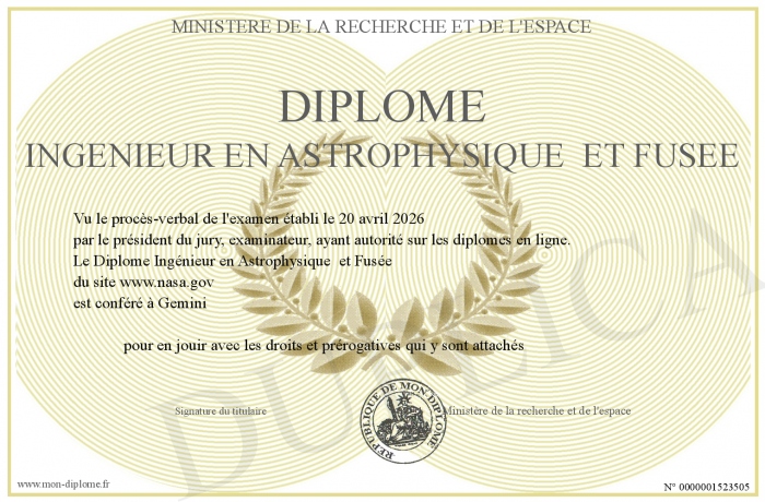 Envoyez par email votre Diplôme Ingénieur en Astrophysique et Fusée personalisé