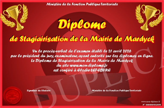 Envoyez par email votre Diplôme de Stagiairisation de la Mairie de Mardyck personalisé