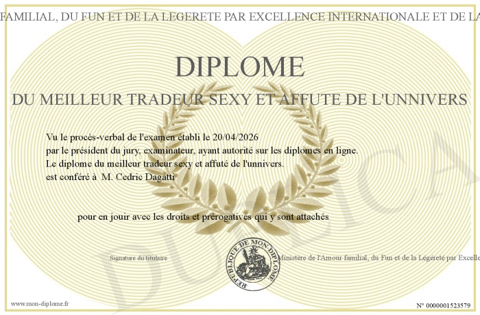 Envoyez par email votre Diplôme du Meilleur Tradeur Sexy et Affuté de l'unnivers personalisé