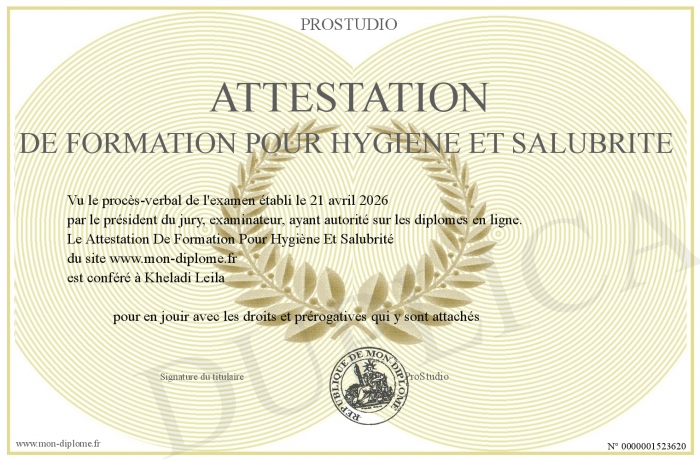 Envoyez par email votre Attestation De Formation Pour Hygiène Et Salubrité personalisé