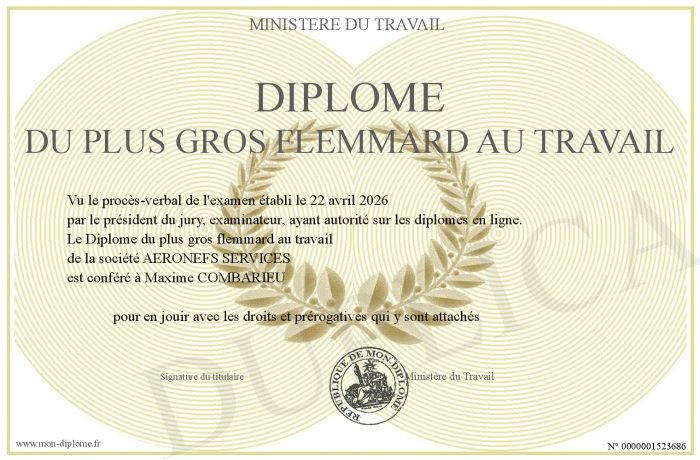 Envoyez par email votre Diplôme du plus gros flemmard au travail personalisé