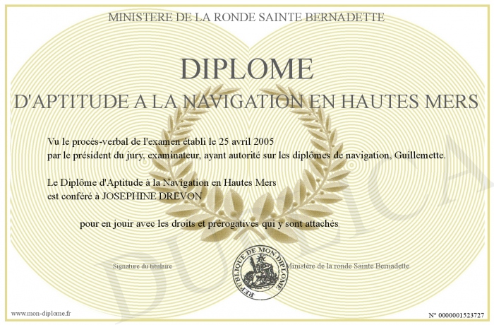 Envoyez par email votre Diplôme d'aptitude a la navigation en hautes mers personalisé