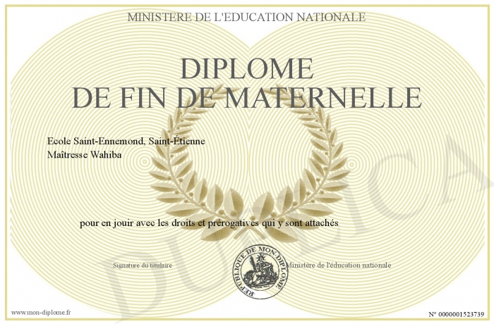 Envoyez par email votre Diplôme de fin de Maternelle personalisé