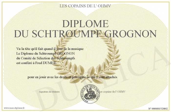 Envoyez par email votre Diplôme du Schtroumpf GROGNON personalisé