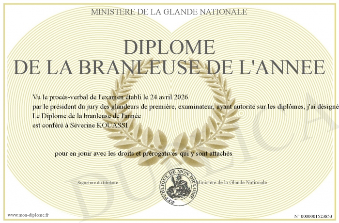 Envoyez par email votre Diplôme de la branleuse de l'année personalisé