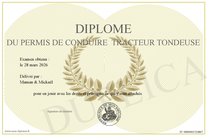 Envoyez par email votre Diplôme du PERMIS DE CONDUIRE TRACTEUR TONDEUSE personalisé
