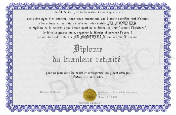 Envoyez par email votre Diplôme du branleur retraité personalisé