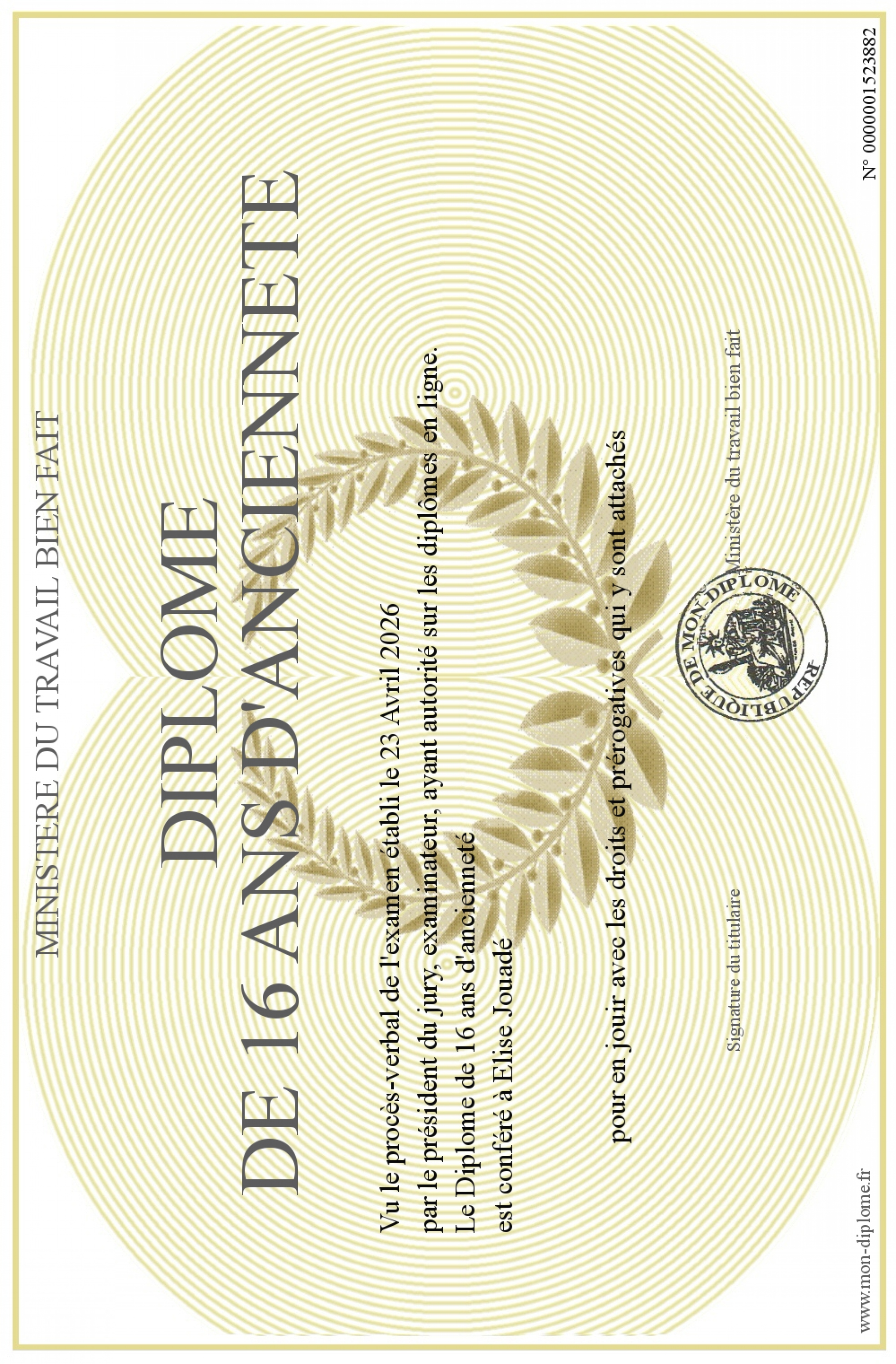 Envoyez par email votre Diplôme de 16 ans d'ancienneté personalisé