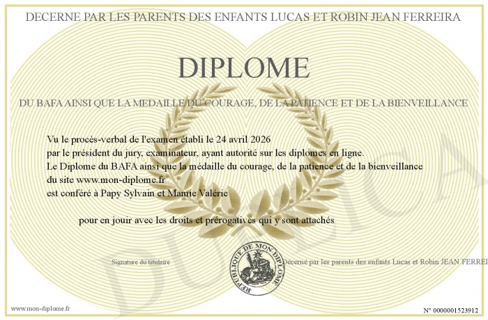 Envoyez par email votre Diplôme du BAFA ainsi que la médaille du courage, de la patience et de la bienveillance personalisé