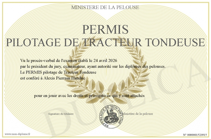 Envoyez par email votre PERMIS pilotage de Tracteur Tondeuse personalisé