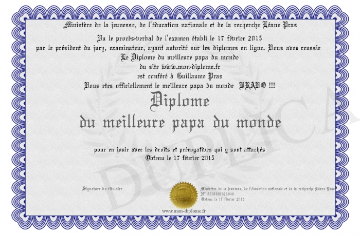 Envoyez par email votre Diplôme du meilleure papa du monde personalisé