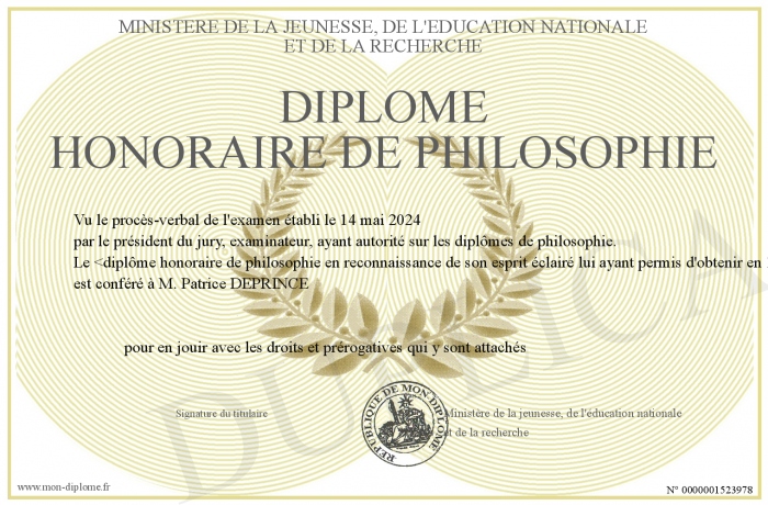 Envoyez par email votre Diplôme honoraire de Philosophie personalisé