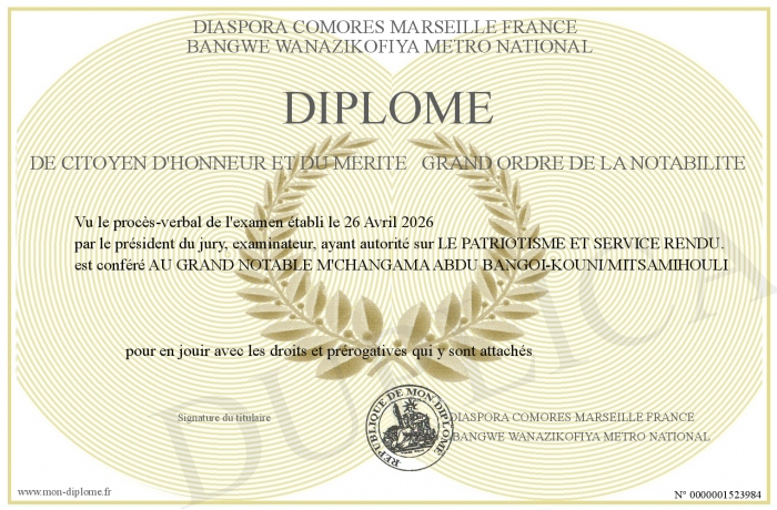 Envoyez par email votre DIPLOME DE CITOYEN D'HONNEUR ET DU MERITE GRAND ORDRE DE LA NOTABILITE personalisé