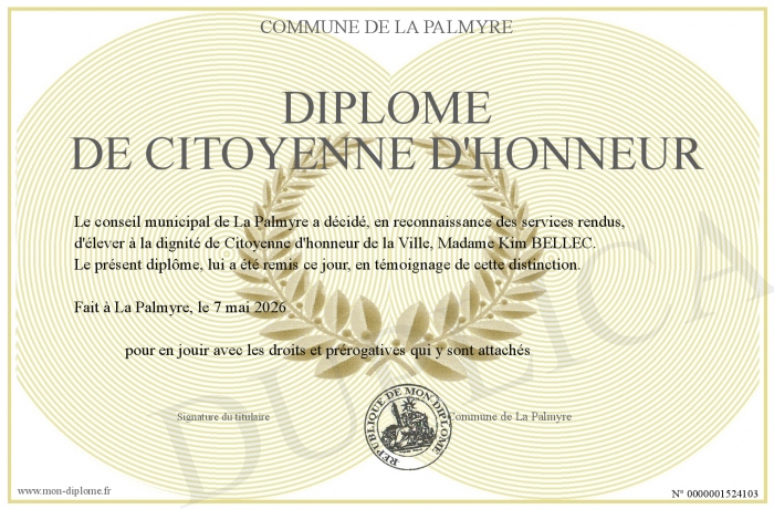 Envoyez par email votre Diplome de citoyenne d'honneur personalisé