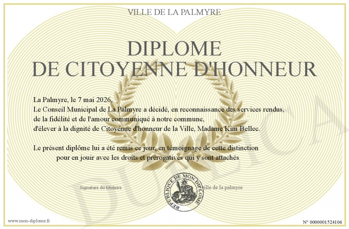 Envoyez par email votre Diplôme de citoyenne d'honneur personalisé