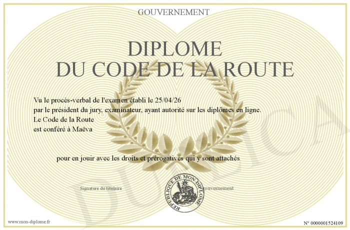 Envoyez par email votre Diplôme du code de la route personalisé