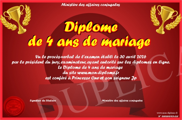 Envoyez par email votre Diplôme de 4 ans de mariage personalisé