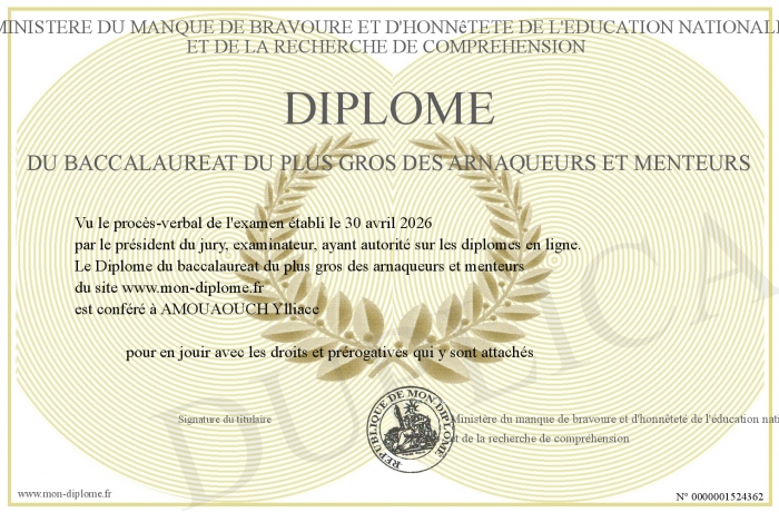 Envoyez par email votre Diplôme du baccalaureat du plus gros des arnaqueurs et menteurs personalisé