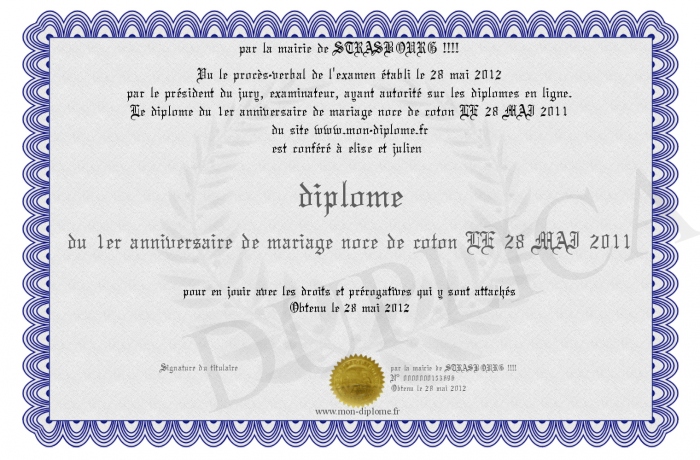 Envoyez par email votre diplôme du 1er anniversaire de mariage noce de coton LE 28 MAI 2011 personalisé