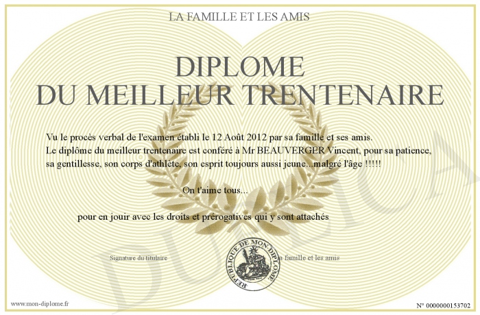 Envoyez par email votre Diplôme du meilleur trentenaire personalisé