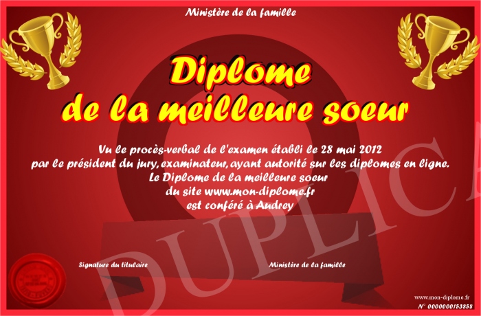 Envoyez par email votre Diplôme de la meilleure soeur personalisé