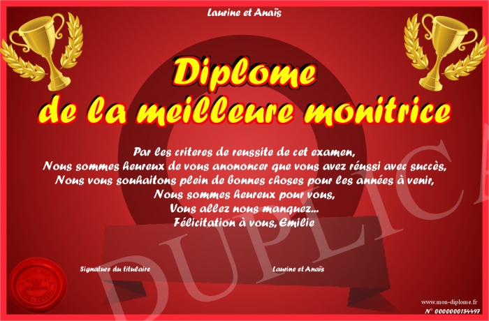 Envoyez par email votre Diplôme de la meilleure monitrice personalisé
