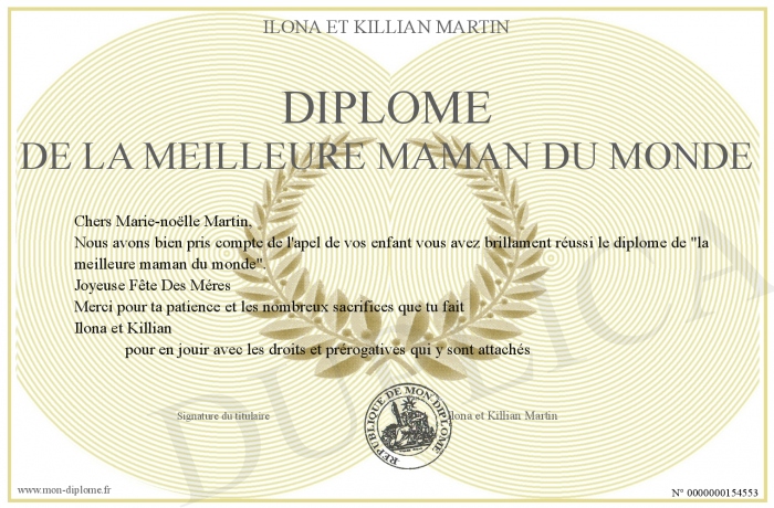 Envoyez par email votre Diplome De La Meilleure Maman Du Monde personalisé