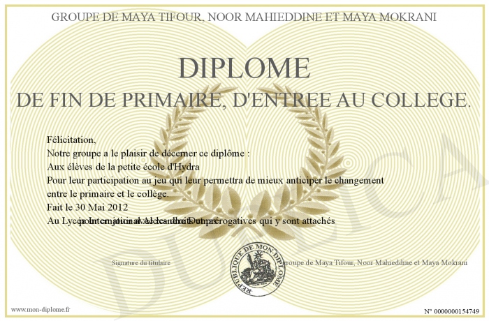 Envoyez par email votre Diplôme de fin de primaire, d'entrée au collége. personalisé