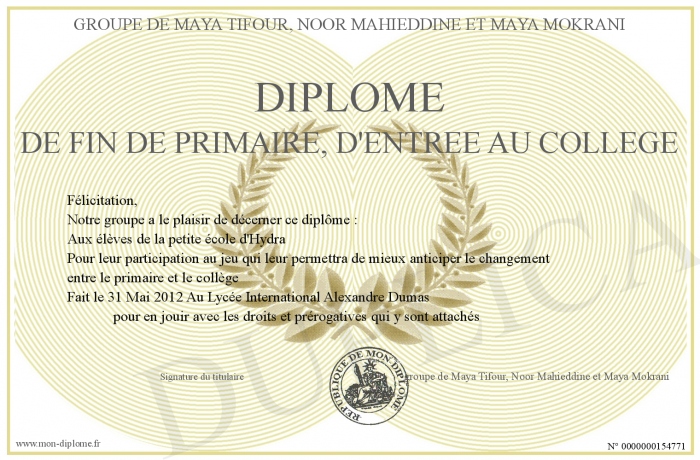 Envoyez par email votre Diplôme de fin de primaire, d'entrée au collège personalisé